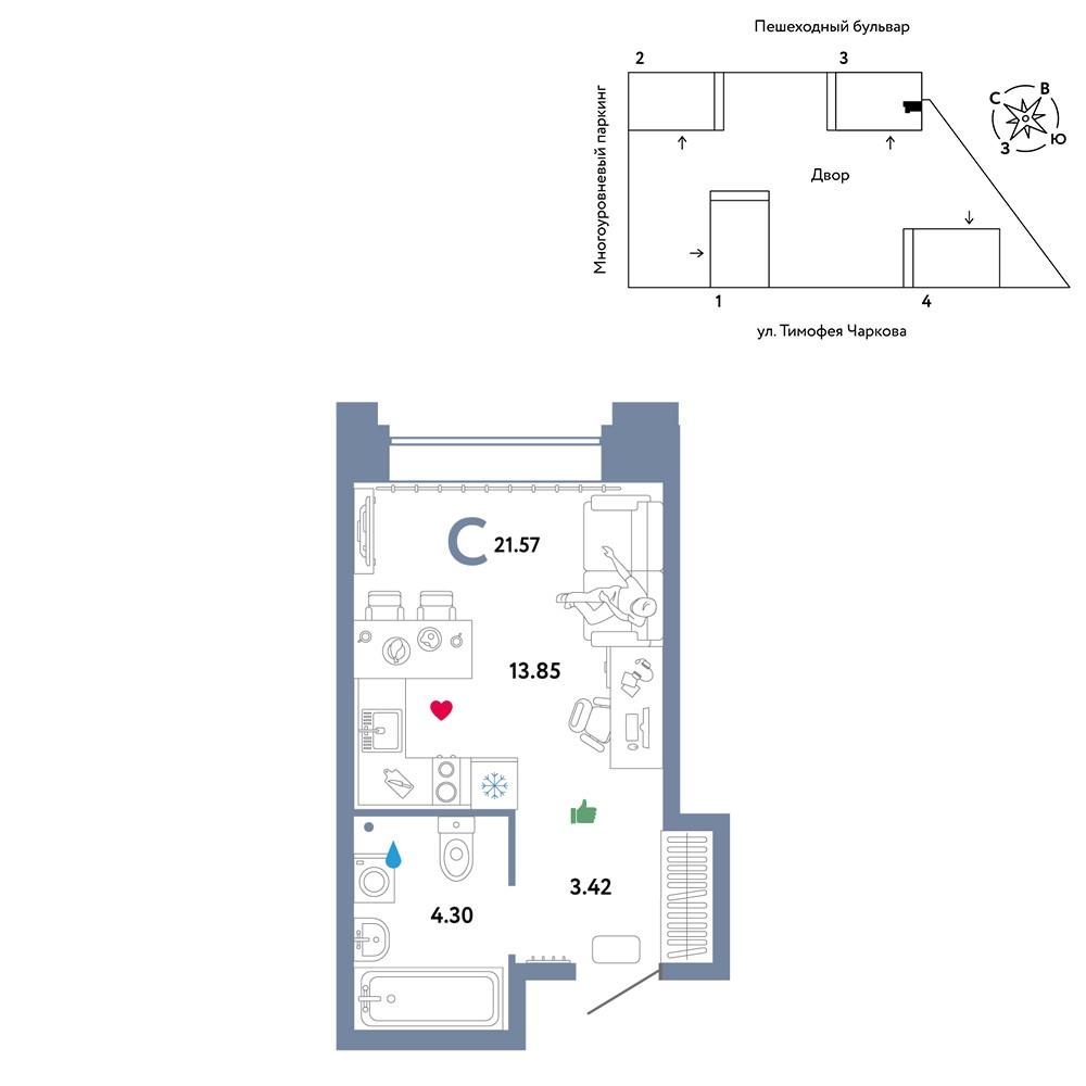 общая 21,57 м2, жилая 10,25 м2, кухни 13,85 м2 |
