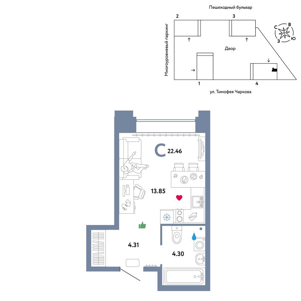 общая 22,46 м2, жилая 10,29 м2, кухни 13,85 м2 |