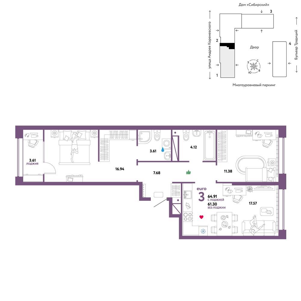 | Трехкомнатная квартира по ул. Андрея Кореневского, 7 в Тюмени |