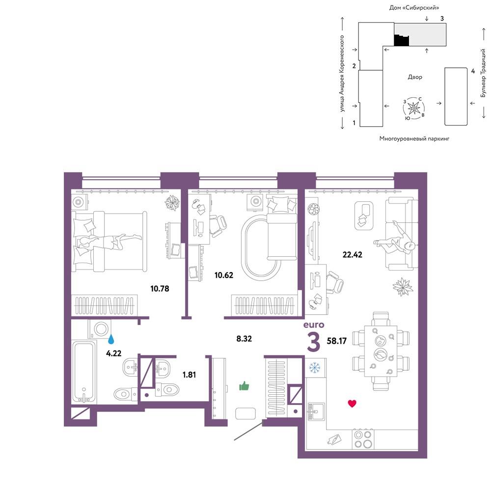 | Трехкомнатная квартира по ул. Андрея Кореневского, 7 в Тюмени |