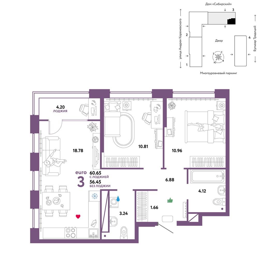 | Трехкомнатная квартира по ул. Андрея Кореневского, 7 в Тюмени |