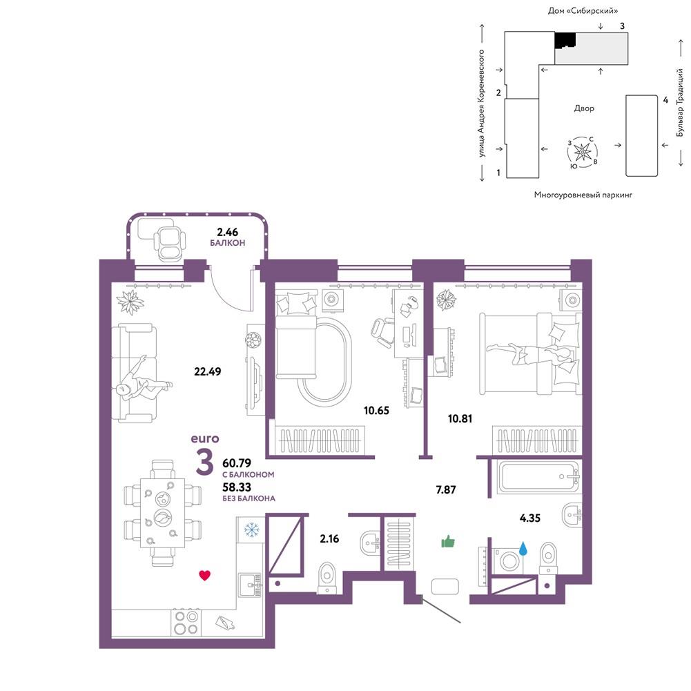 | Трехкомнатная квартира по ул. Андрея Кореневского, 7 в Тюмени |