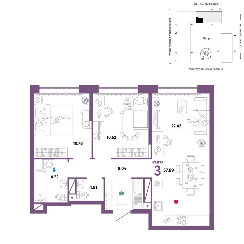 | Трехкомнатная квартира по ул. Андрея Кореневского, 7 в Тюмени |