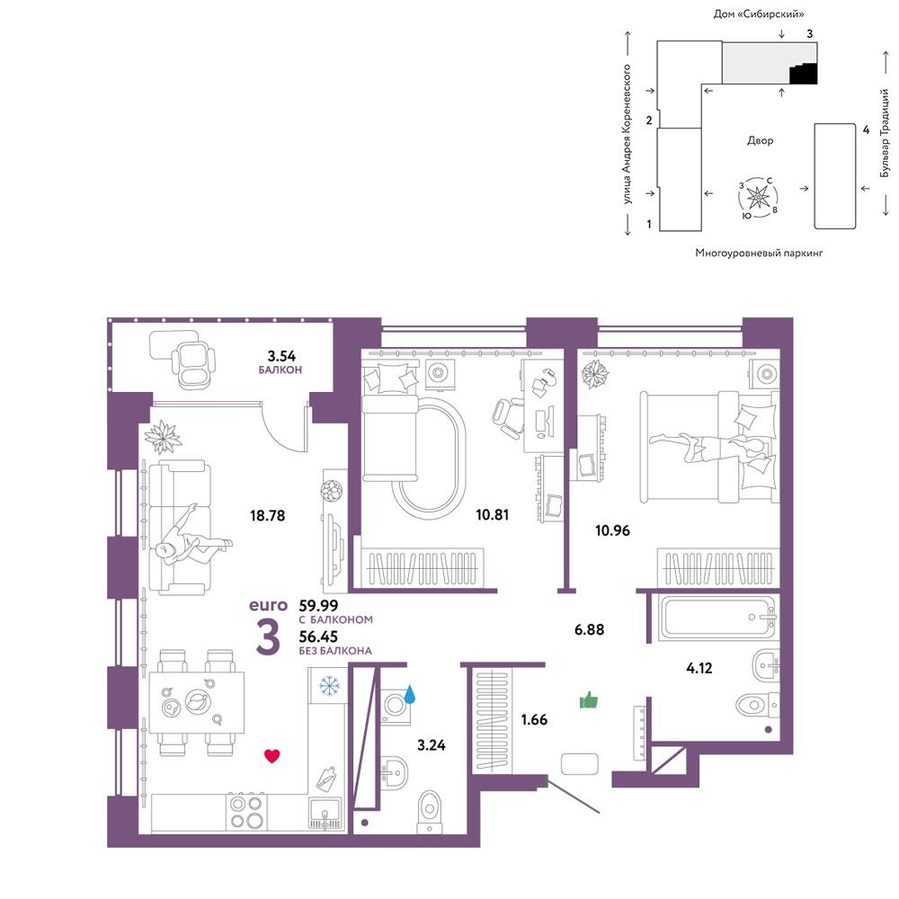 | Трехкомнатная квартира по ул. Андрея Кореневского, 7 в Тюмени |