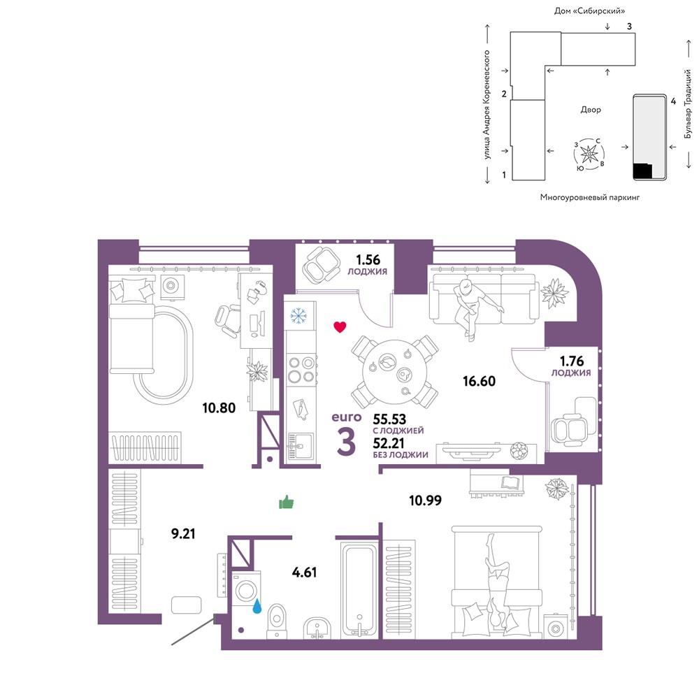 Трехкомнатная квартира 55,53 м2 по ул. Андрея Кореневского 7 за 6190000 руб. |