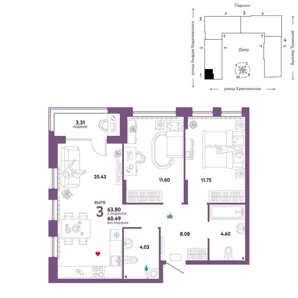| Трехкомнатная квартира по ул. Андрея Кореневского, 11 в Тюмени |
