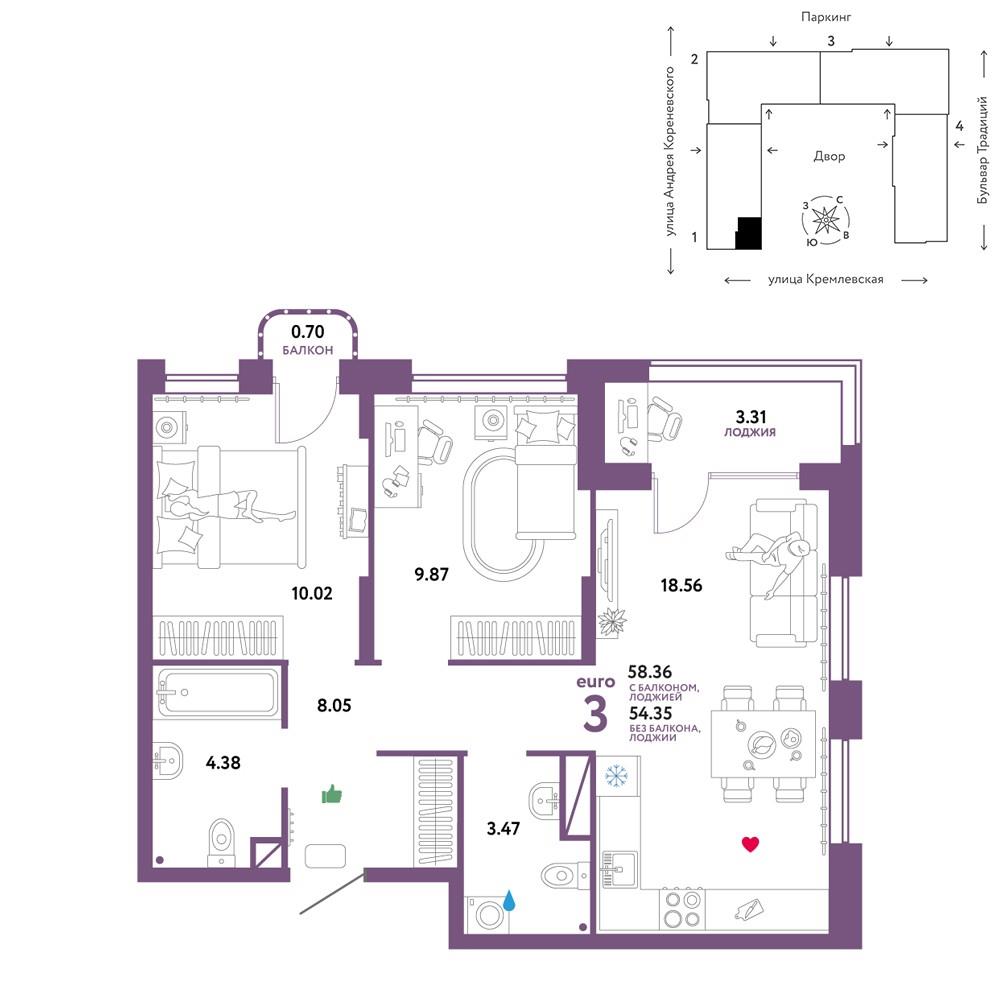 общая 58,36 м2, жилая 30,8 м2, кухни 18,56 м2 |
