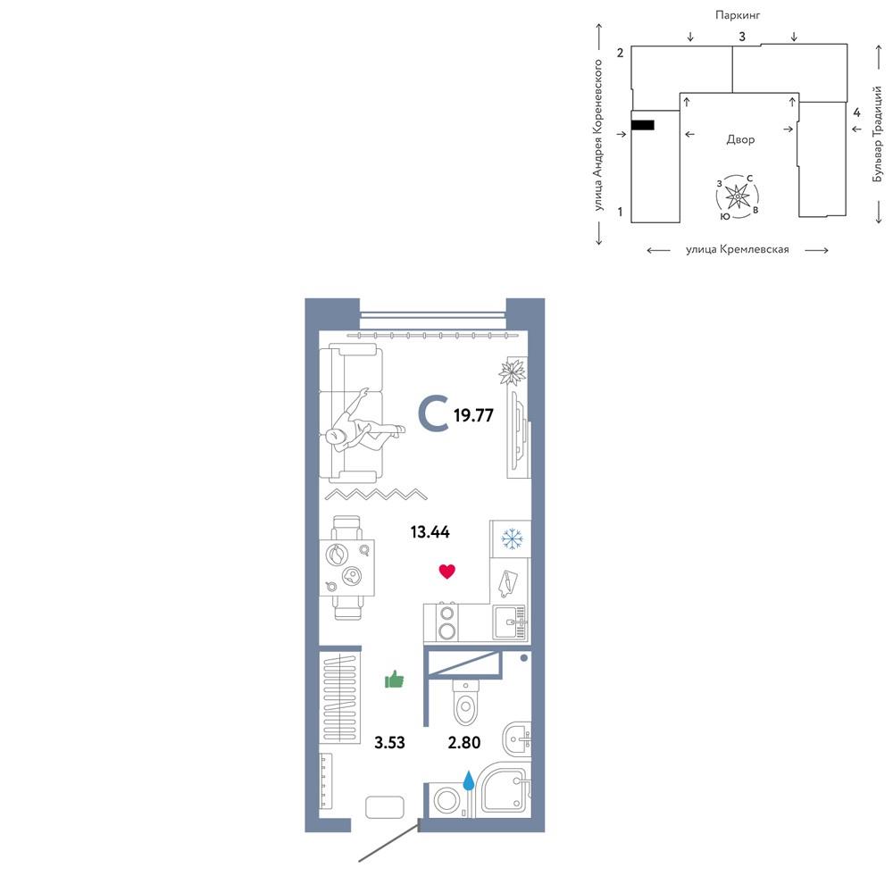 общая 19,77 м2, жилая 13,44 м2, кухни 13,44 м2 |