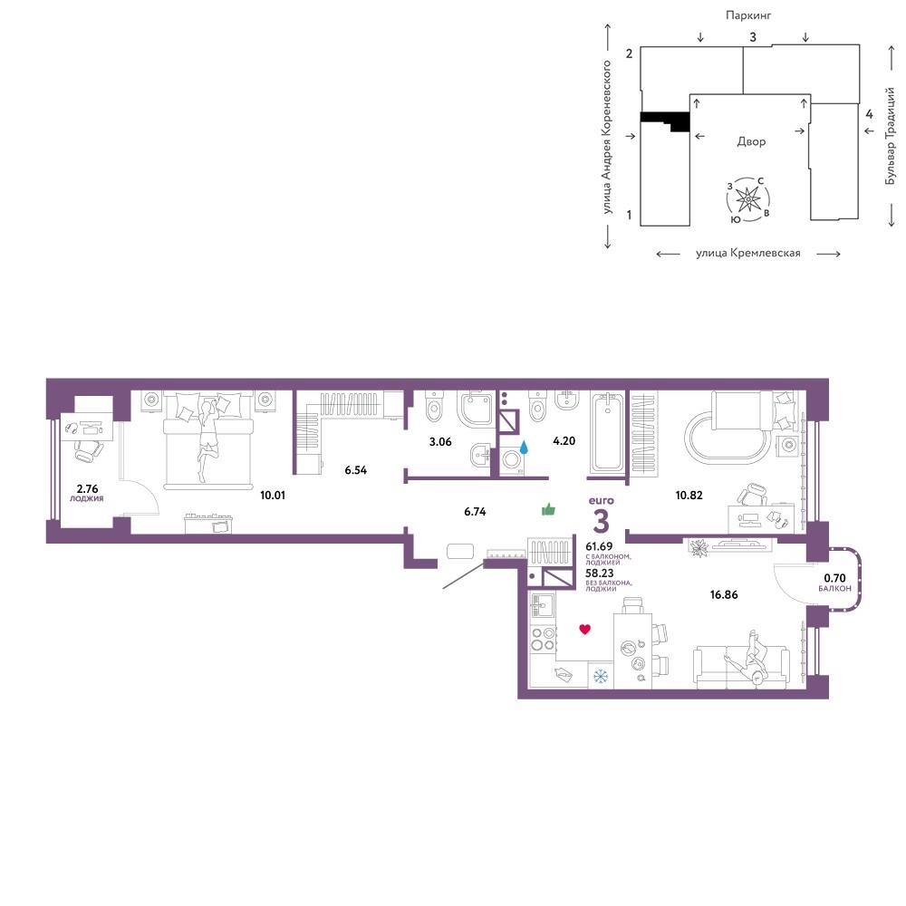 общая 61,69 м2, жилая 32,38 м2, кухни 16,86 м2 |
