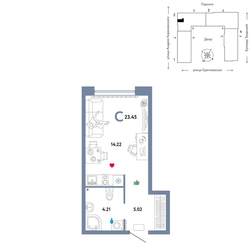 квартира 23,45 м2 по ул. Андрея Кореневского 11 за 3490000 руб. |