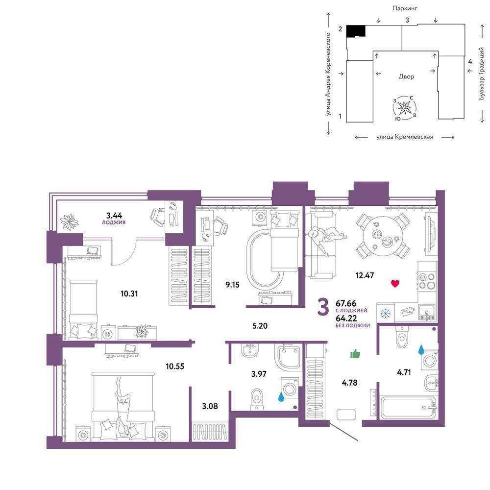 Трехкомнатная квартира 67,66 м2 по ул. Андрея Кореневского 11 за 7314000 руб. |