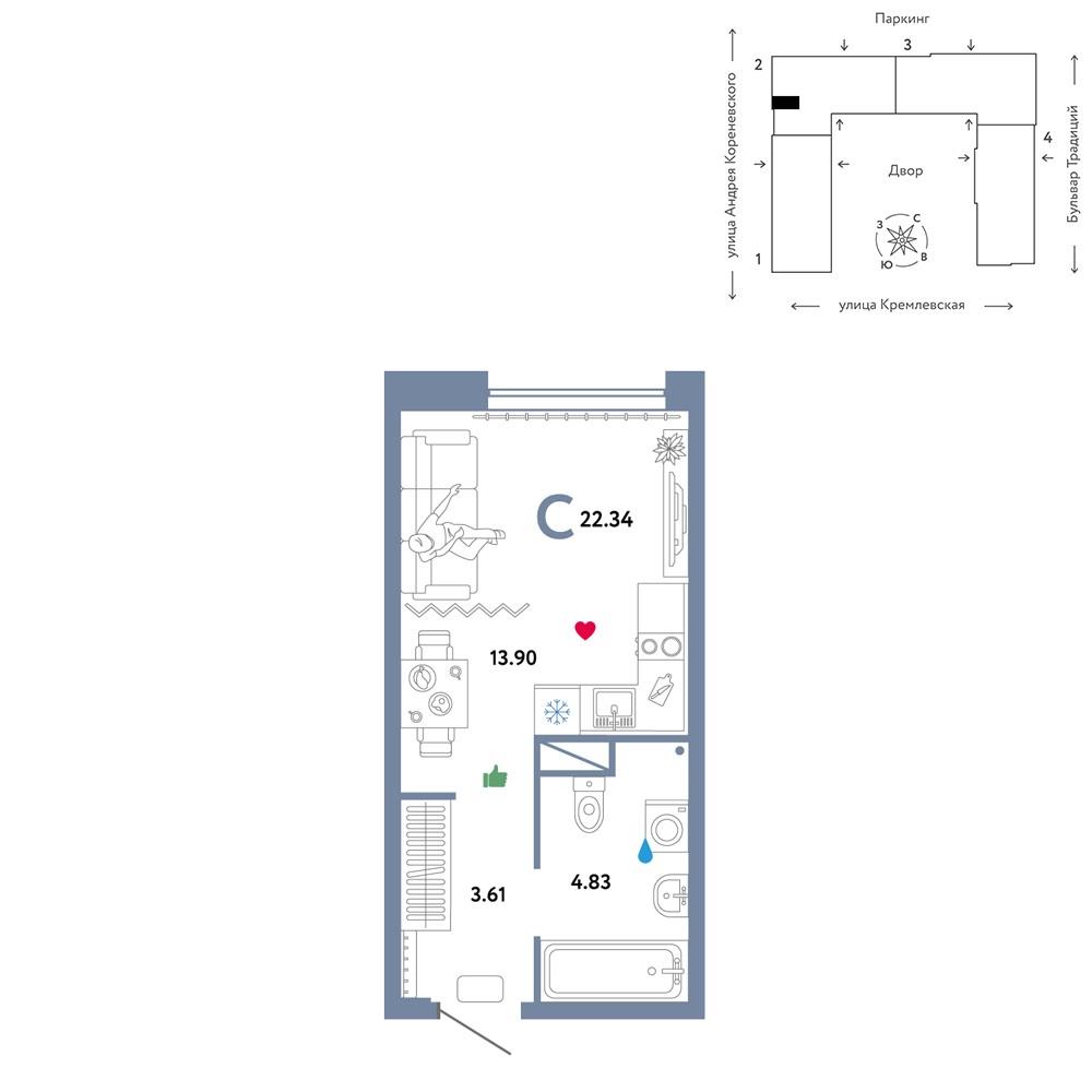 общая 22,34 м2, жилая 13,9 м2, кухни 13,9 м2 |