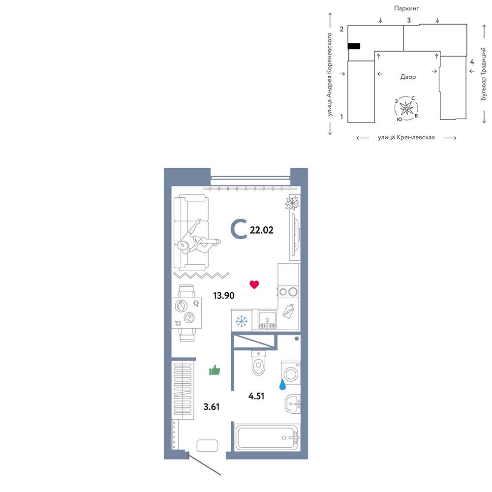 общая 22,02 м2, жилая 13,9 м2, кухни 13,9 м2 |