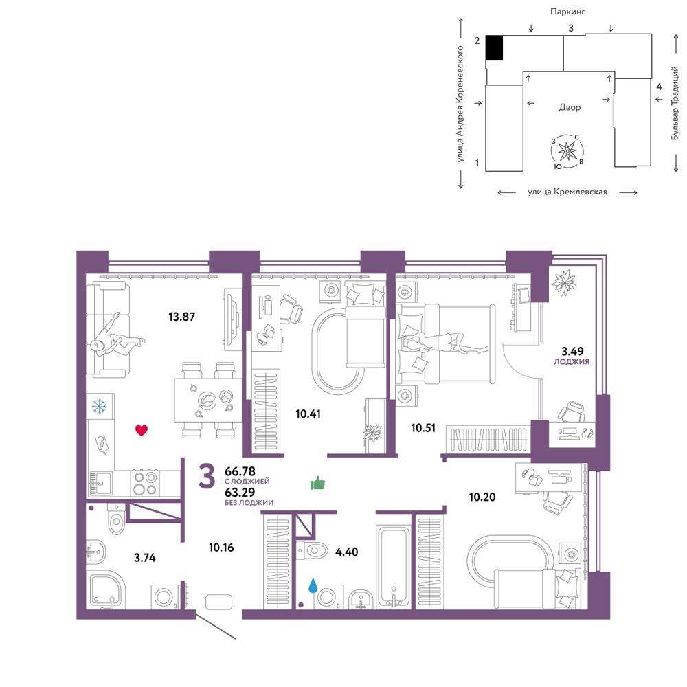 общая 66,78 м2, жилая 31,12 м2, кухни 13,87 м2 |