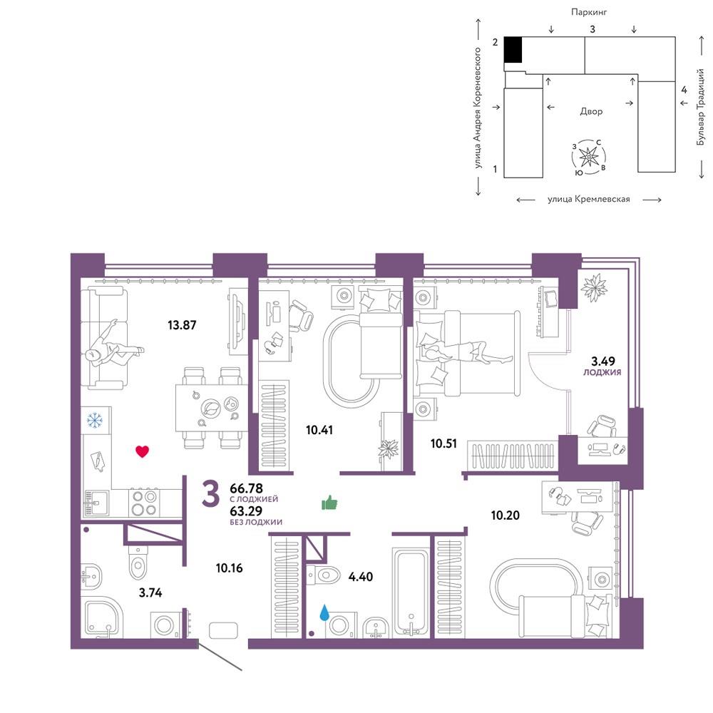 общая 66,78 м2, жилая 31,12 м2, кухни 13,87 м2 |