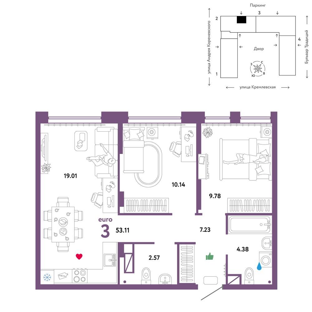Трехкомнатная квартира 53,11 м2 по ул. Андрея Кореневского 11 за 6290000 руб. |