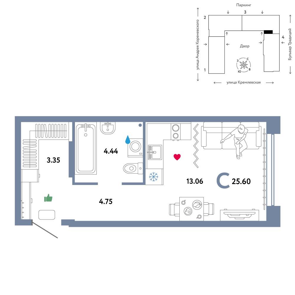 квартира 25,60 м2 по ул. Андрея Кореневского 11 за 3850000 руб. |