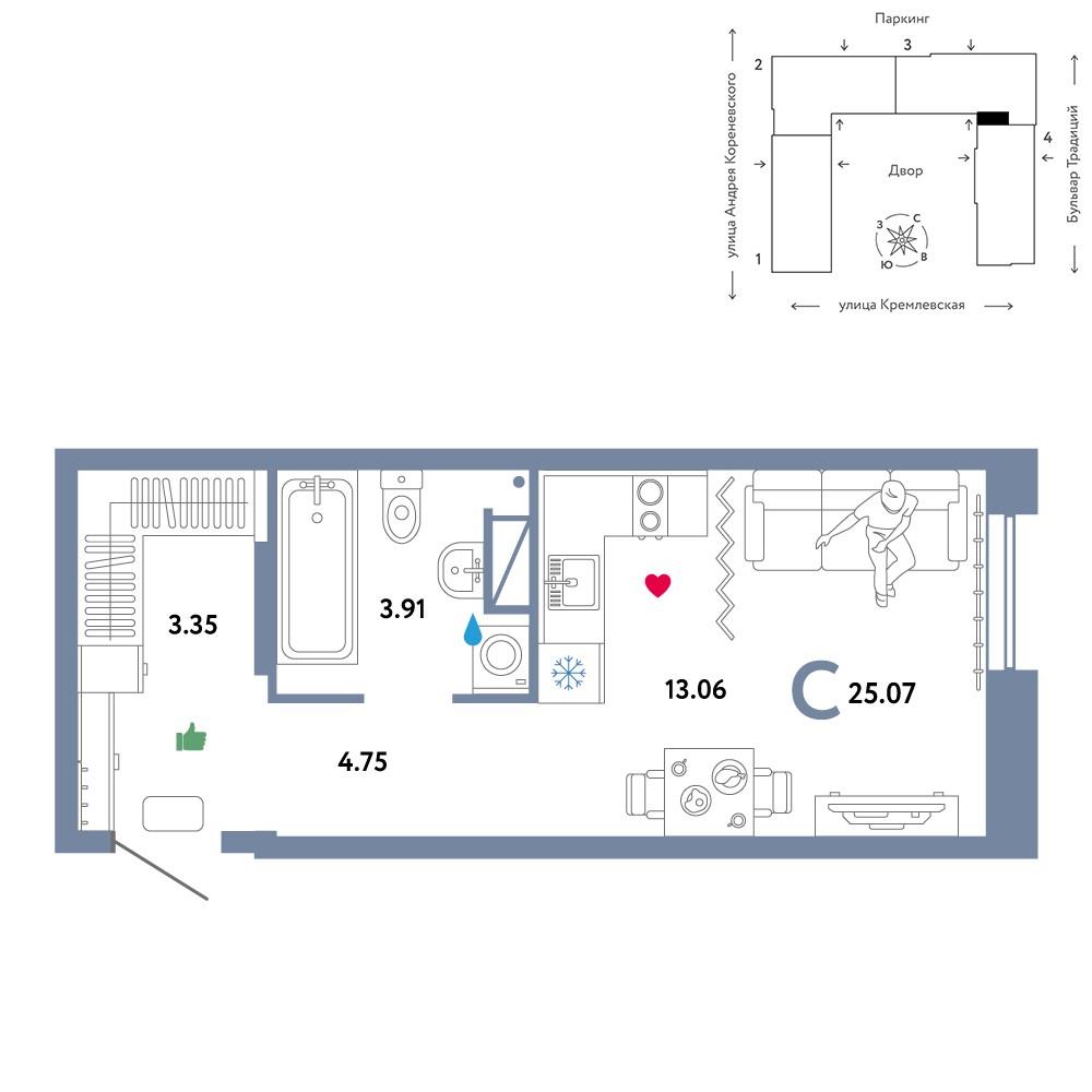 общая 25,07 м2, жилая 13,06 м2, кухни 13,06 м2 |