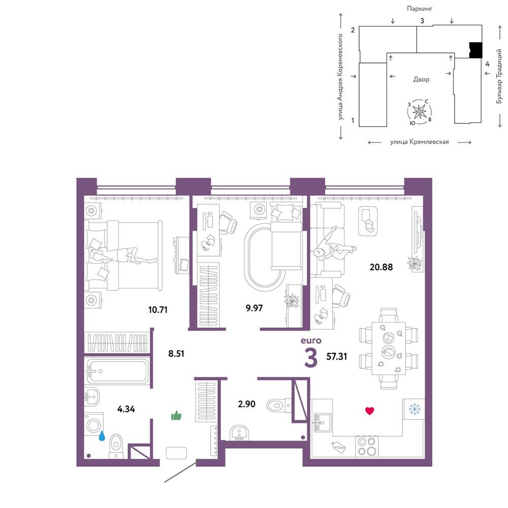 общая 57,31 м2, жилая 35,09 м2, кухни 20,88 м2 |