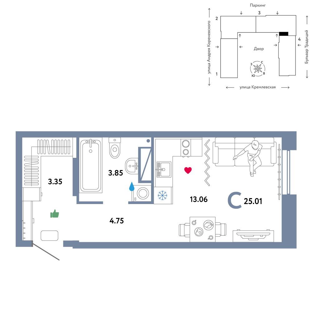 общая 25,01 м2, жилая 13,06 м2, кухни 13,06 м2 |