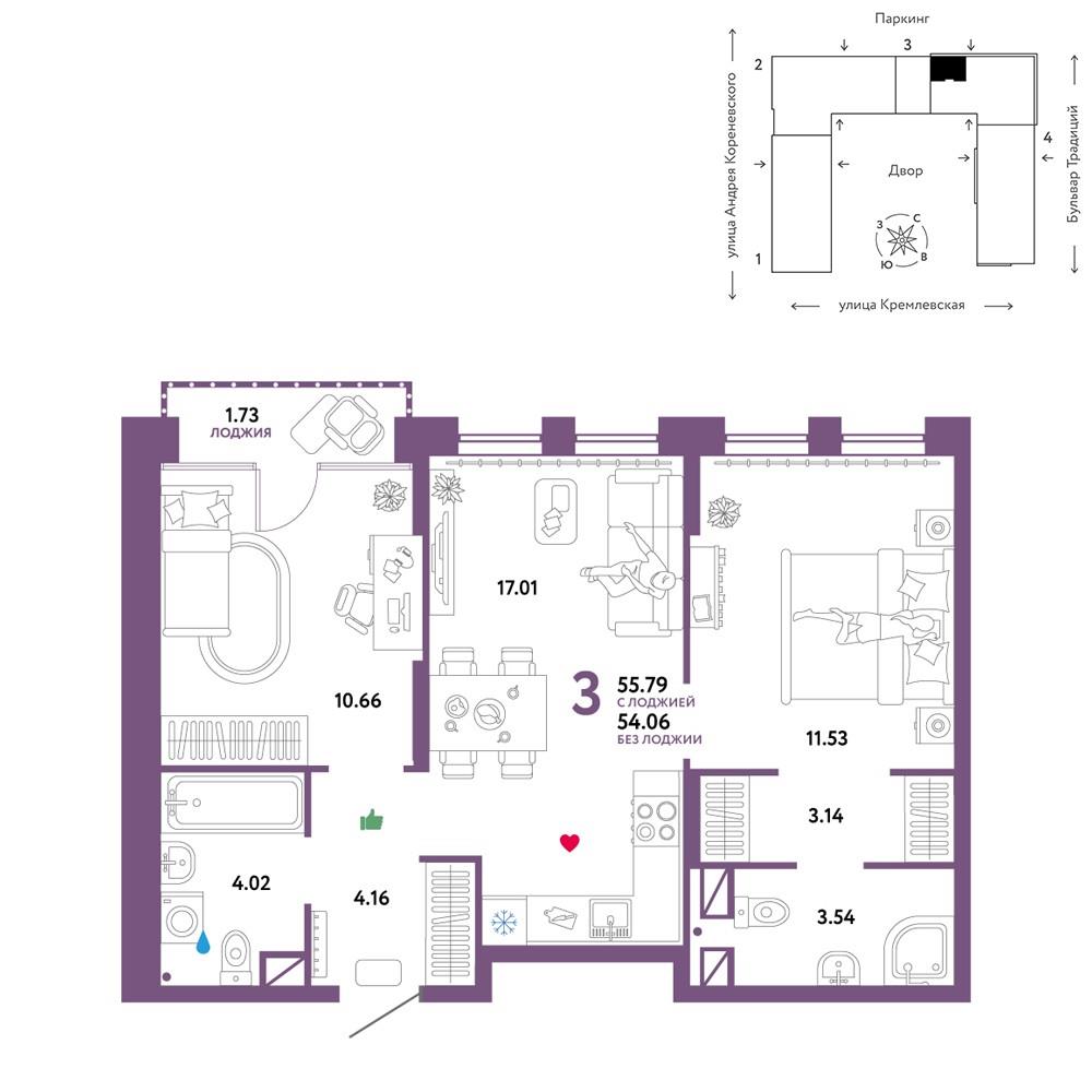 Трехкомнатная квартира 55,79 м2 по ул. Андрея Кореневского 11 за 6320000 руб. |