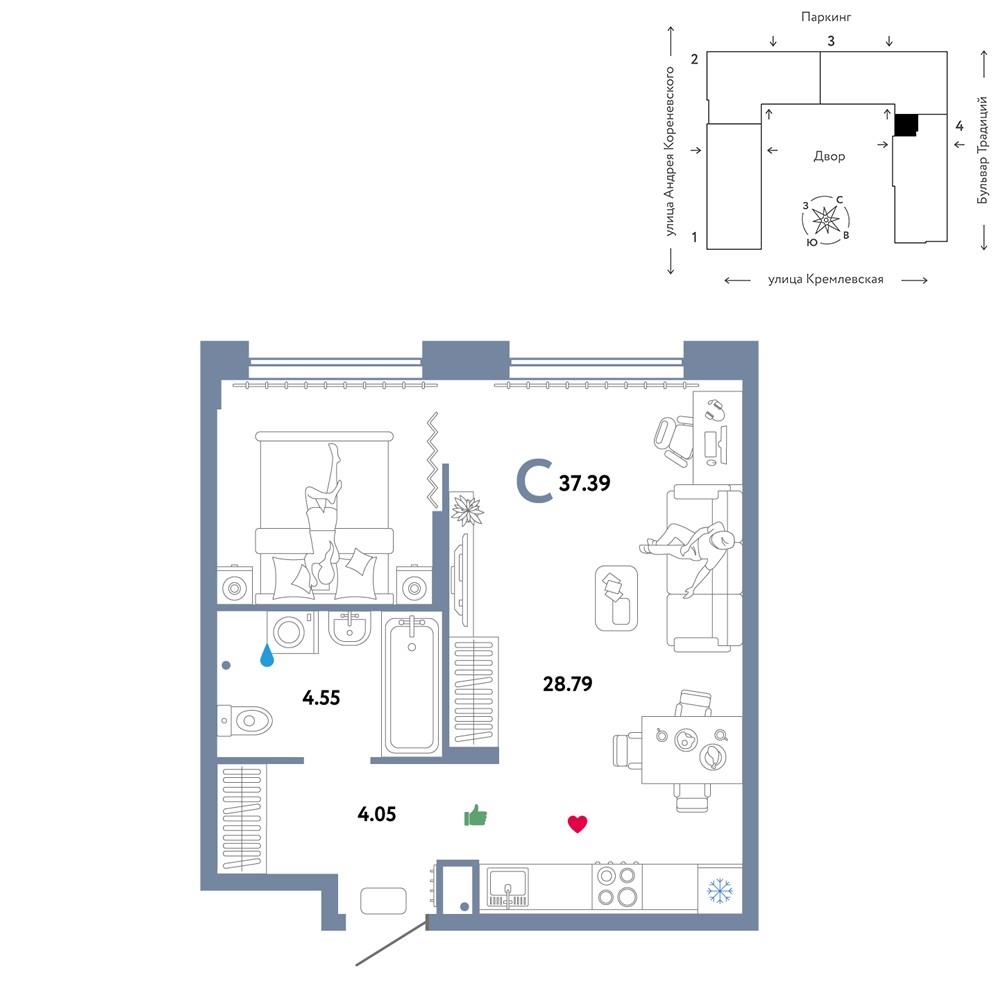 общая 37,39 м2, жилая 22,82 м2, кухни 28,79 м2 |