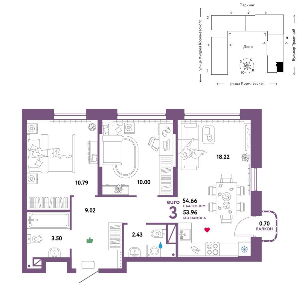 общая 54,66 м2, жилая 33,59 м2, кухни 18,22 м2 |