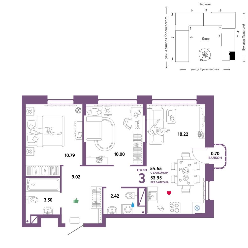 общая 54,65 м2, жилая 33,59 м2, кухни 18,22 м2 |
