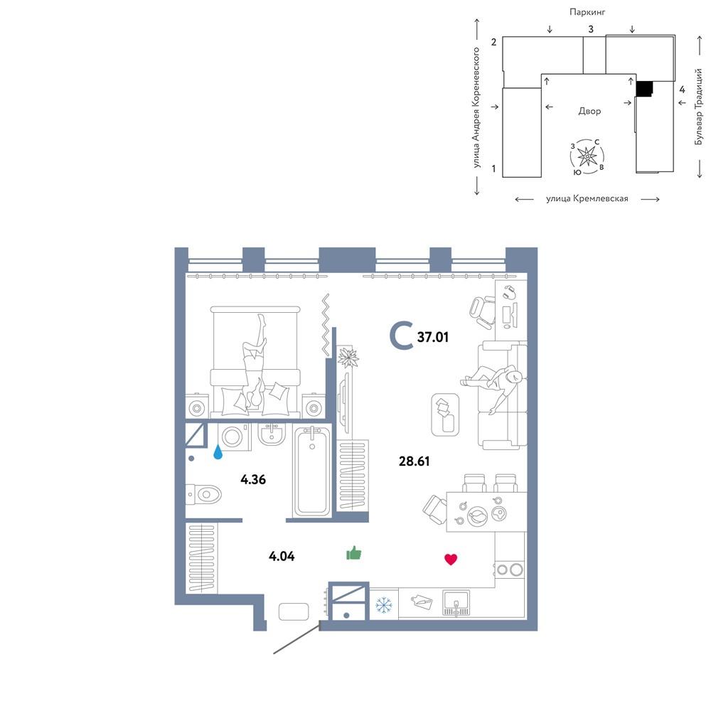 общая 37,01 м2, жилая 22,84 м2, кухни 28,61 м2 |
