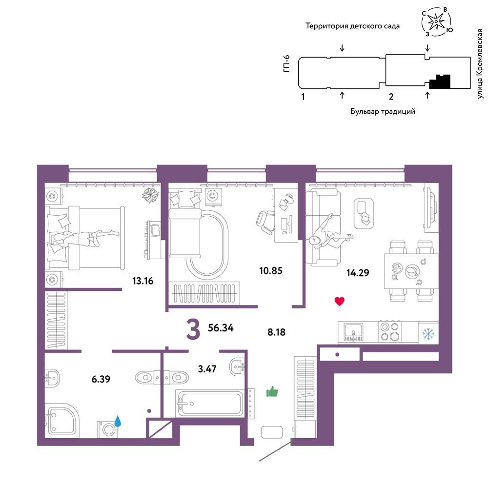 общая 56,34 м2, жилая 35,39 м2, кухни 14,29 м2 |