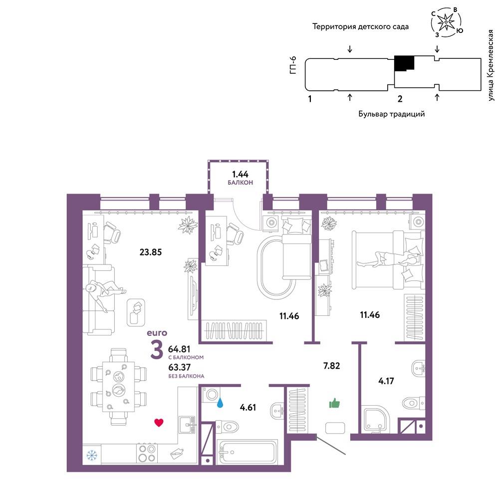 общая 64,81 м2, жилая 39,15 м2, кухни 23,85 м2 |