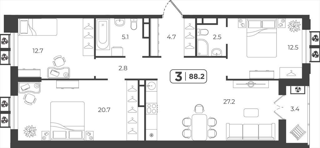 Трехкомнатная квартира 88,24 м2 по ул. ул Холодильная 31к1 за 9508000 руб. |