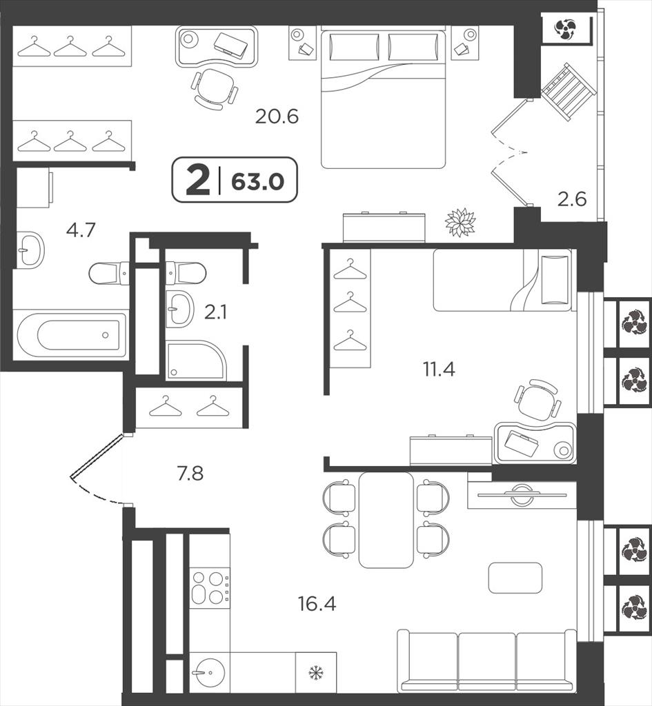 Двухкомнатная квартира 63,05 м2 по ул. ул Холодильная 31к1 за 8060000 руб. |