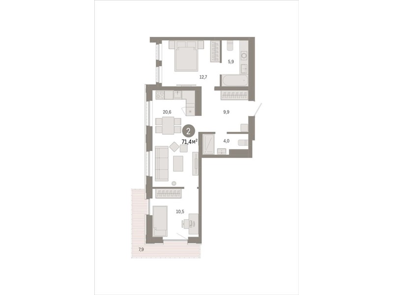 Квартира с кухней-гостиной и двумя спальнями в Октябрьском на Туре. Особенности планировки: вид во двор, предчистовая отделка, мастер-спальня, балкон.