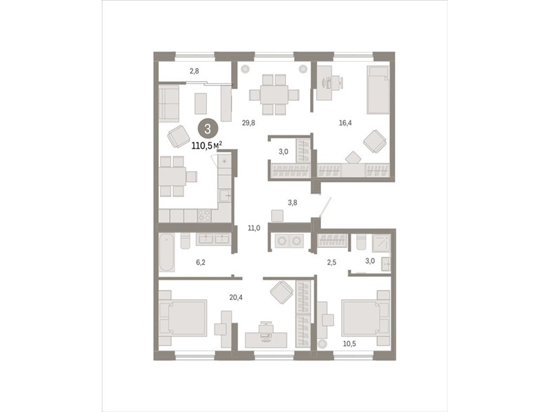 Квартира с кухней-гостиной и тремя спальнями в Октябрьском на Туре. Особенности планировки: предчистовая отделка, мастер-спальня, вид во двор, тёплая лоджия, разнесённые спальни, постирочная.