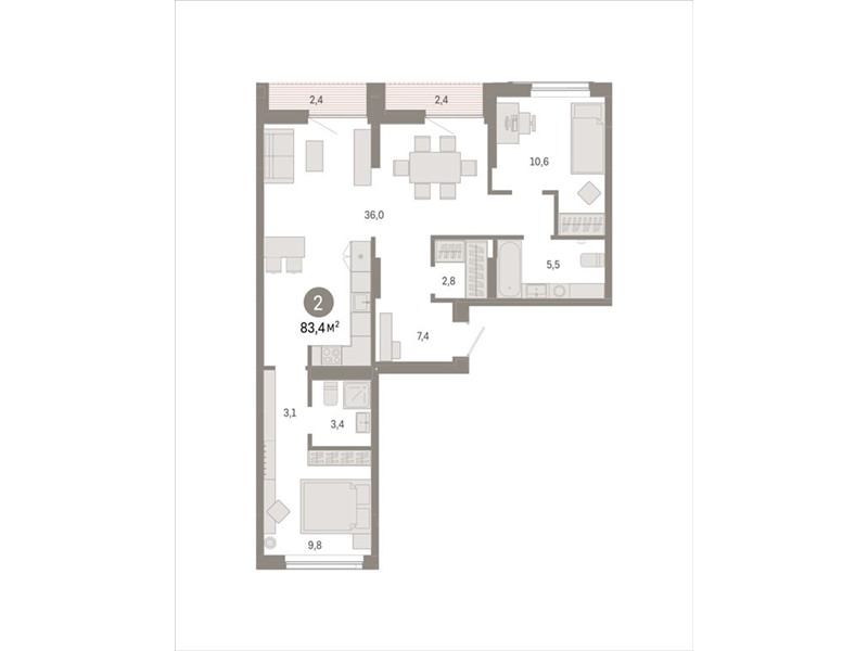 Квартира с кухней-гостиной и двумя спальнями в Октябрьском на Туре. Особенности планировки: вид во двор, лоджия, мастер-спальня, предчистовая отделка, разнесённые спальни.