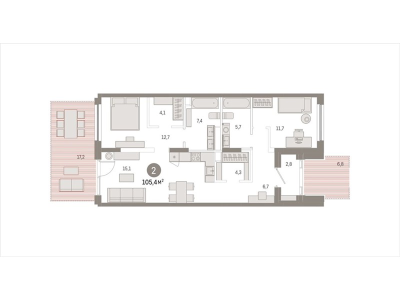 общая 105,4 м2, жилая 24,42 м2, кухни 26,02 м2 |