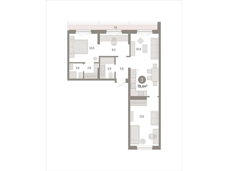 Квартира с кухней-гостиной и тремя спальнями в Октябрьском на Туре. Особенности планировки: вид во двор, мастер-спальня, предчистовая отделка, рабочий кабинет, разнесённые спальни, терраса на крыше.