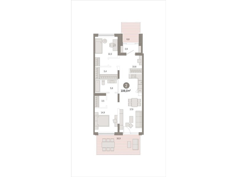 Квартира с кухней-гостиной и двумя спальнями в Октябрьском на Туре. Особенности планировки: вид во двор, мастер-спальня, окна в пол, отдельный вход, панорамное остекление, разнесённые спальни, свободная планировка, терраса.