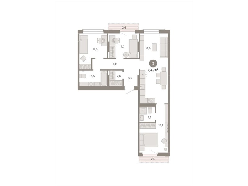 Квартира с кухней-гостиной и тремя спальнями в Октябрьском на Туре. Особенности планировки: балкон, предчистовая отделка, разнесённые спальни.