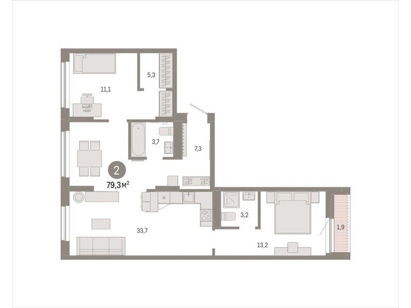 Квартира с кухней-гостиной и двумя спальнями в Октябрьском на Туре. Особенности планировки: вид во двор, лоджия, разнесённые спальни, предчистовая отделка, мастер-спальня.