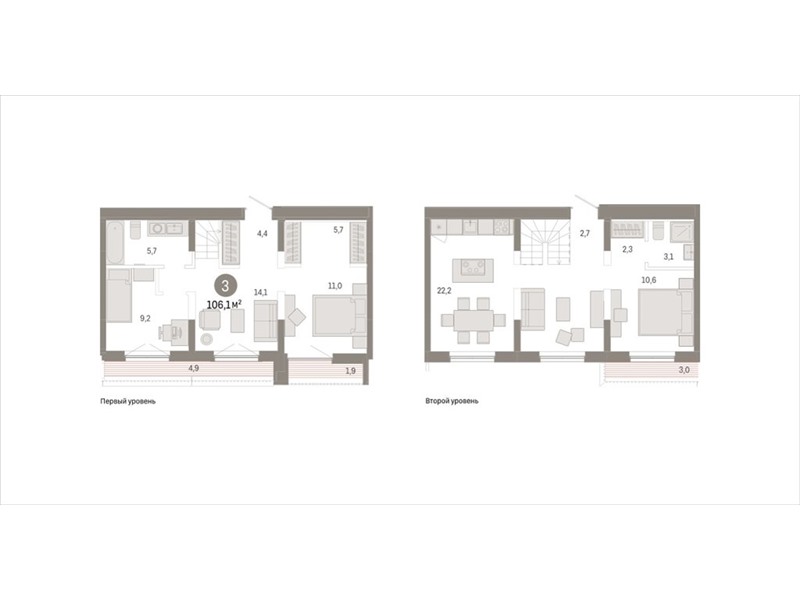 Двухуровневая квартира с кухней-гостиной и тремя спальнями в Октябрьском на Туре. Особенности планировки: двухуровневая, разнесённые спальни, свободная планировка, терраса на крыше.