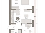 общая 56,4 м2, жилая 23,89 м2, кухни 16,4 м2 |