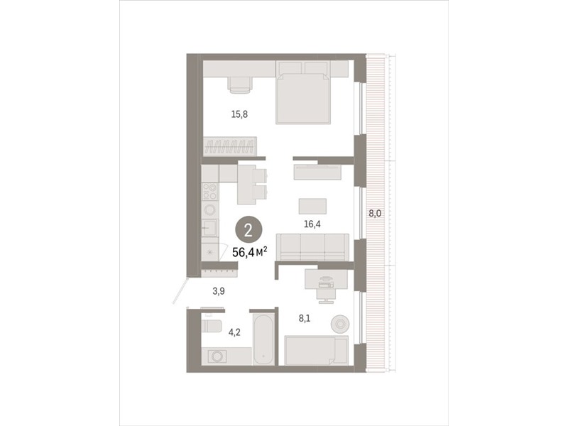 Квартира с кухней-гостиной и двумя спальнями в Октябрьском на Туре. Особенности планировки: разнесённые спальни, предчистовая отделка, терраса на крыше.
