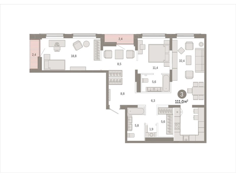 общая 110,97 м2, жилая 38,7 м2, кухни 32,43 м2 |