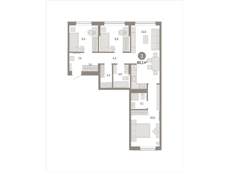 Квартира с кухней-гостиной и тремя спальнями в Октябрьском на Туре. Особенности планировки: предчистовая отделка, мастер-спальня, вид во двор, разнесённые спальни, постирочная.