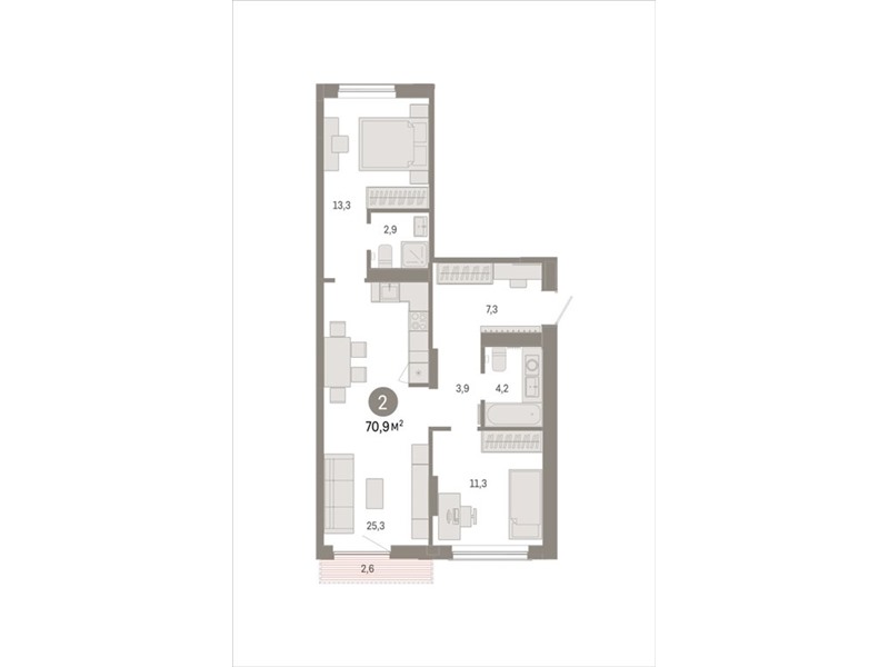 Квартира с кухней-гостиной и двумя спальнями в Октябрьском на Туре. Особенности планировки: балкон, вид во двор, мастер-спальня, предчистовая отделка, разнесённые спальни.