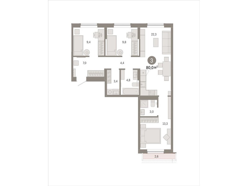 | Трехкомнатная квартира по ул. ул. Краснооктябрьская, 4, корпус 2 в Тюмени |