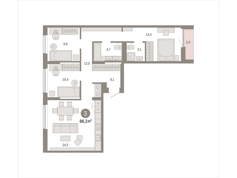 Квартира с кухней-гостиной и тремя спальнями в Октябрьском на Туре. Особенности планировки: лоджия, предчистовая отделка, мастер-спальня, вид во двор, разнесённые спальни.