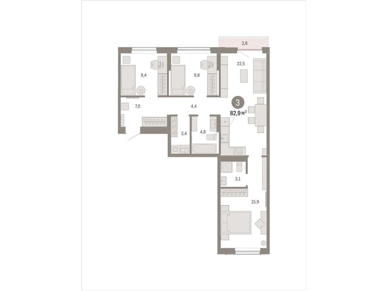 Квартира с кухней-гостиной и тремя спальнями в Октябрьском на Туре. Особенности планировки: вид во двор, разнесённые спальни, предчистовая отделка, мастер-спальня, постирочная, балкон.